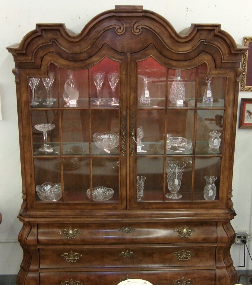 Additionally, the lower cabinet also contains one adjustable shelf broyhill curio cabinet. Framed interior and sealed bottom.